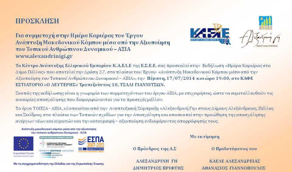 Το ΚΕΚ ΚΑΕΛΕ - ΠΑΡ/ΜΑ ΑΛΕΞΑΝΔΡΕΙΑΣ, ως συντονιστής - εταίρος της Α.Σ. ΑΛΕΞΑΝΔΡΙΝΗ ΓΗ, και στo πλαίσιo του Τοπικού  Σχεδίου για την Απασχόληση ΤΟΠΣΑ "ΑΞΙΑ",  διοργανώνει την εκδήλωση "Ημέρα Καριέρας στον Δήμο Πέλλας"  και καλεί τις τοπικές επιχειρήσεις που δραστηριοποιούνται στην Καλλιέργεια ή/και Μεταποίηση  αγροτικών προϊόντων  ή/και στην Κηποτεχνία, να παρευρεθούν